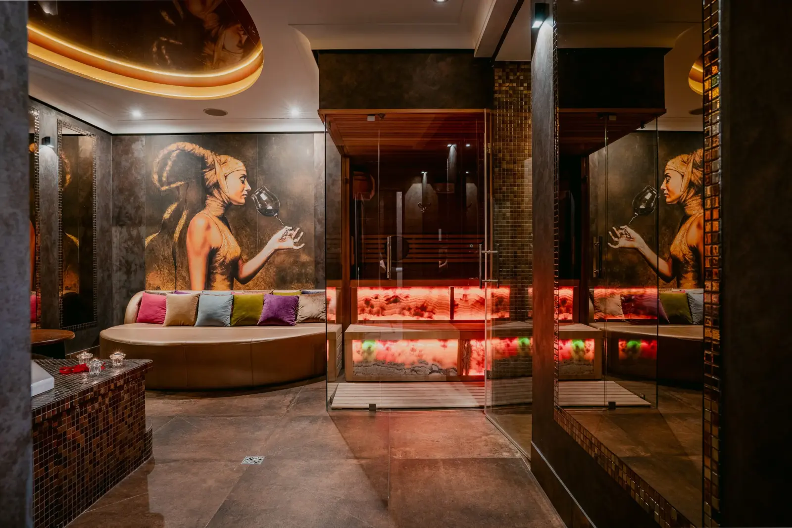 A relaxing bath combined with a session in the Finnish sauna. The ritual is accompanied by a snack of fresh fruit and a bottle of sparkling wine.