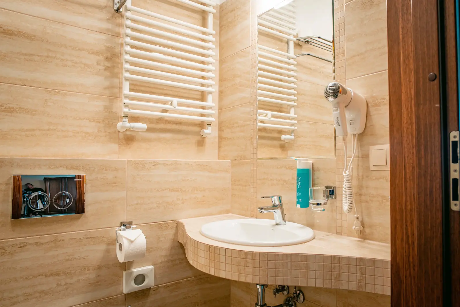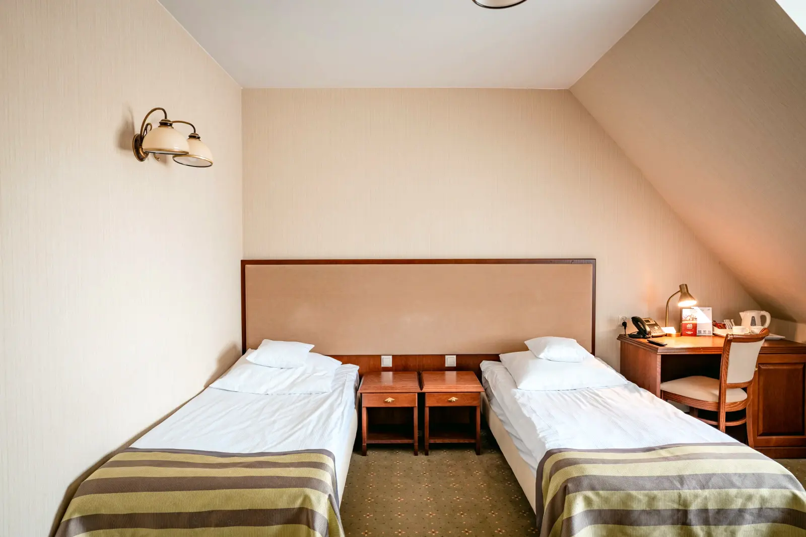 Pokój dwuosobowy z dwoma pojedynczymi łóżkami bez możliwością ich złączenia. Łazienka z prysznicem. Zestaw powitalny do parzenia kawy i herbaty.